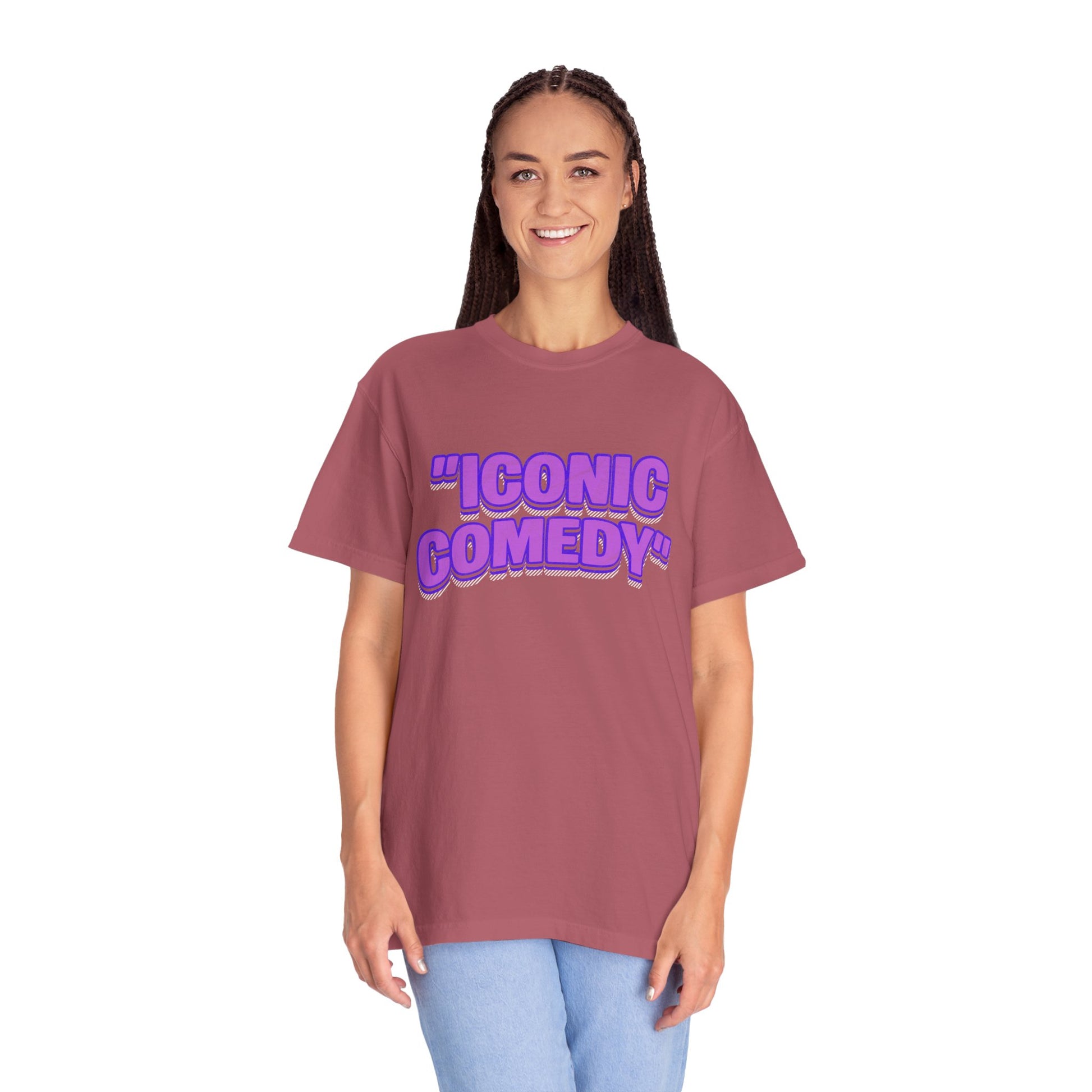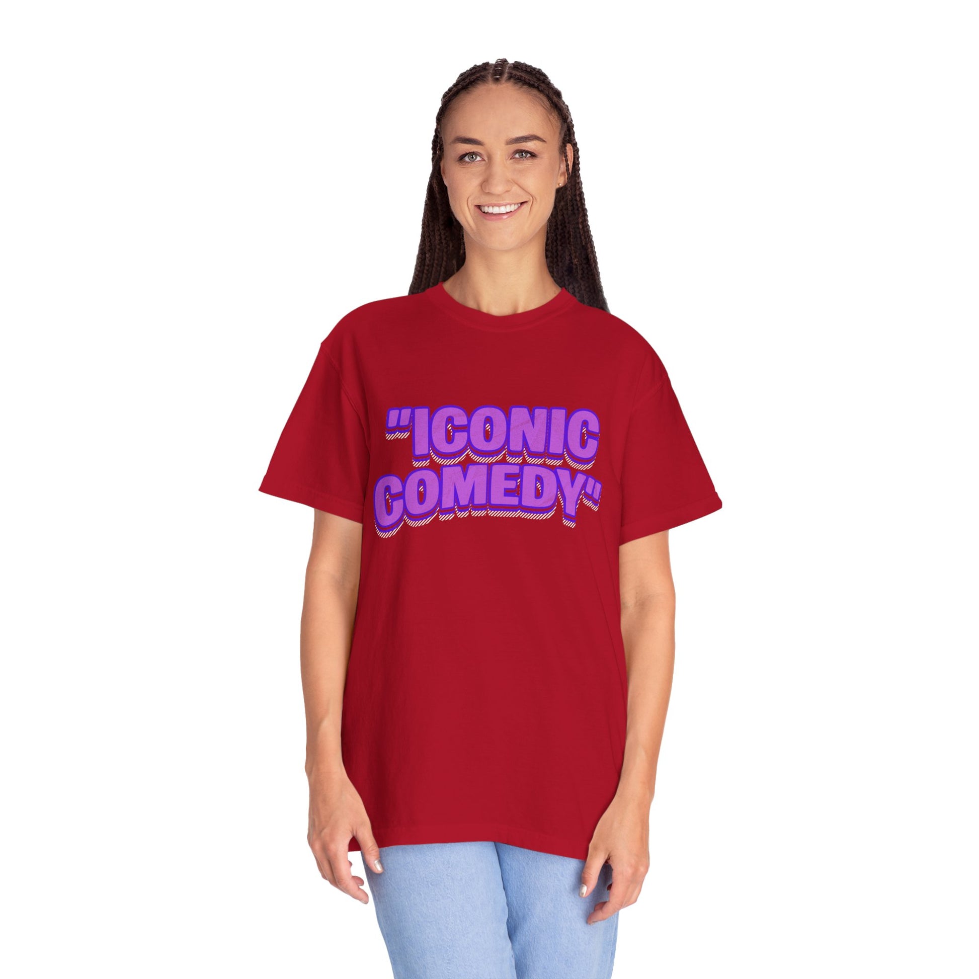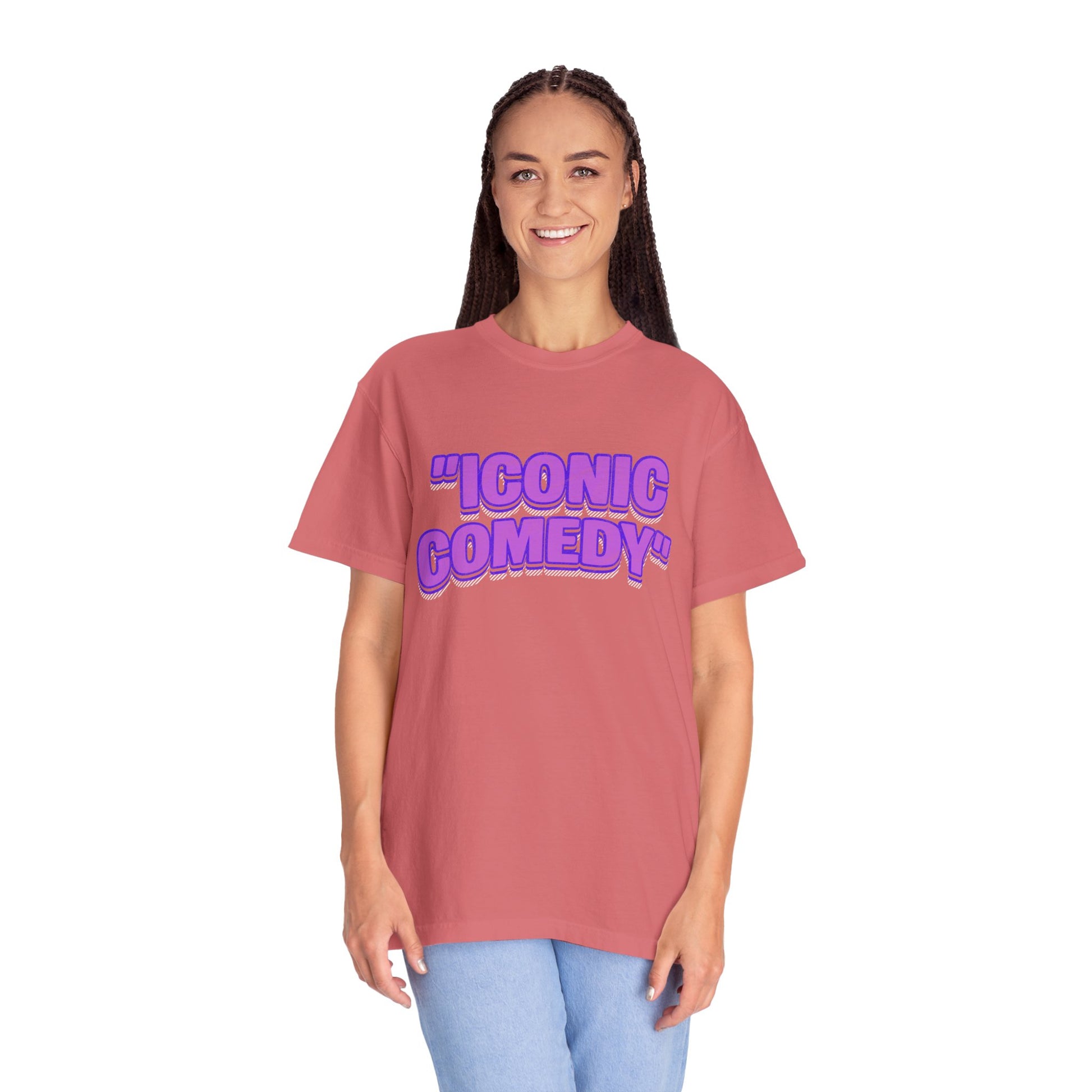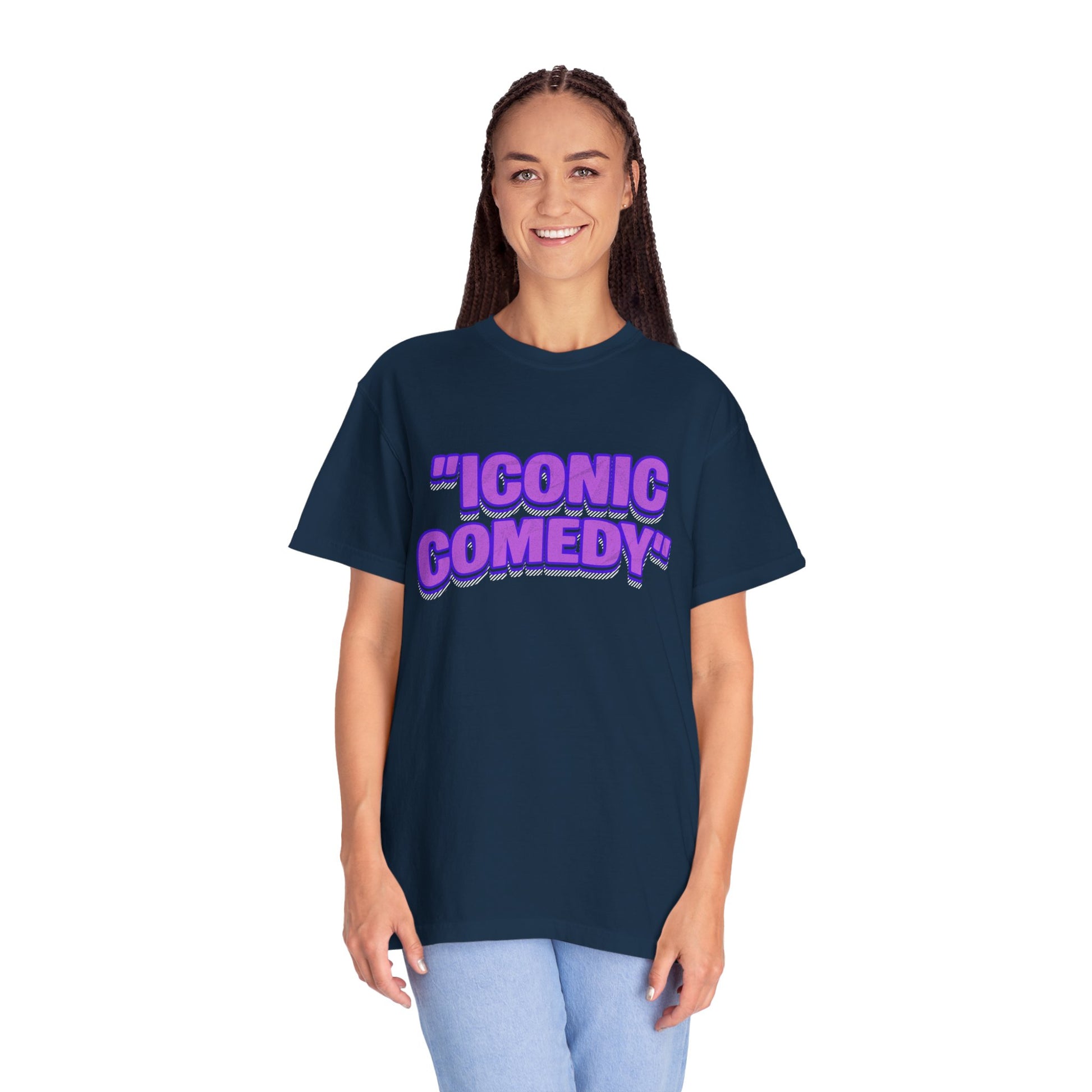 "Iconic Comedy" T-Shirt — Retro Bubble Text Tee with Galaxy 360 Back Logo